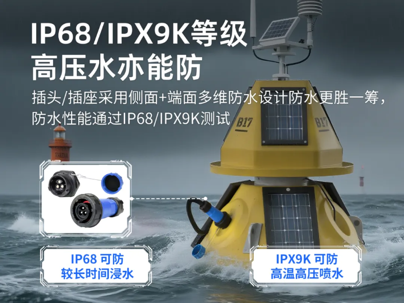 海洋環境監測設備部署周期長達數月甚至數年,無論是潮濕度極高的環境水分,還是惡劣天氣裹挾著的水浪沖擊,都要求設備所用連接器具備高規格的防水性能。