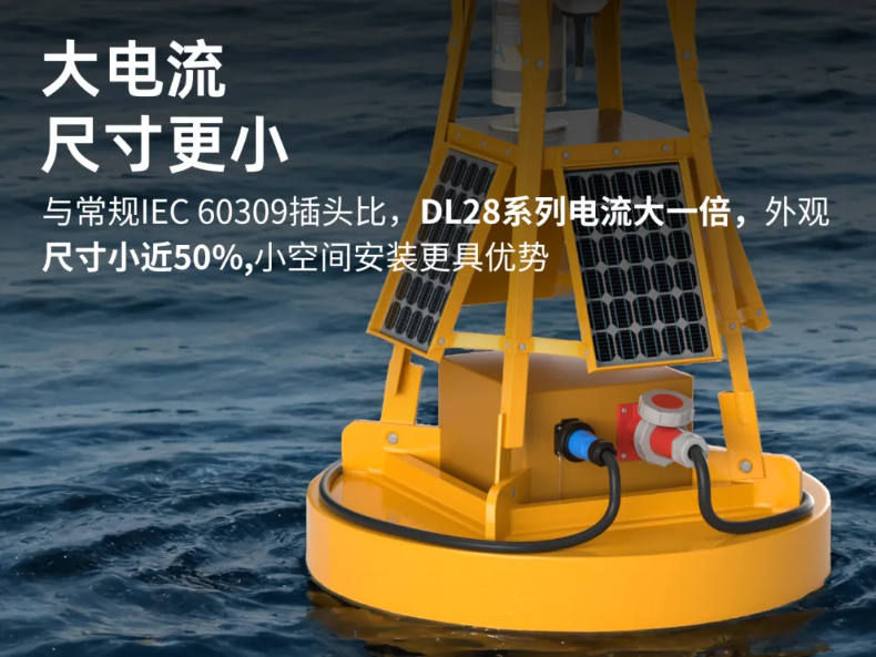 凌科DL28系列工業級連接器,作為小型化大電流連接器的代表,比傳統IEC60309插頭,尺寸小近50%,且為全塑外殼,因而空間優勢明顯,且更加輕量化,更加匹配海洋環境監測設備對連接器空間大小和重量的苛刻要求。