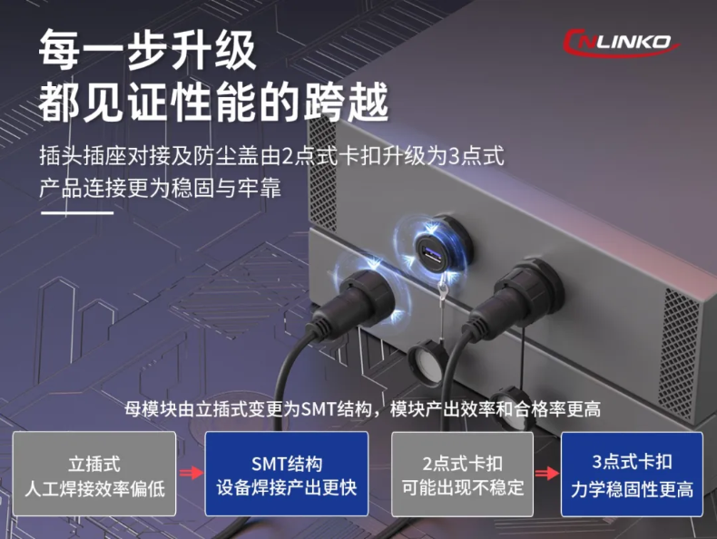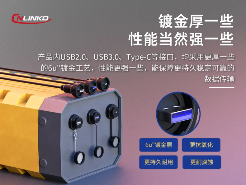 凌科的YU-USB&Type-C多模塊多接口型工業(yè)級(jí)連接器,符合快充協(xié)議,并采用工業(yè)級(jí)標(biāo)準(zhǔn)設(shè)計(jì),具備在戶外與車載等惡劣環(huán)境下防水、防塵、防腐、抗振等性能要求。