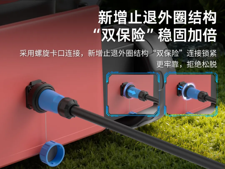 市面上某些大電流連接器,僅滿足了大電流與快充而已,其實“安全性”才是用戶安心使用的壓艙石。對于大電流、強高壓的割草機快充,存在兩大安全隱患:連接部位松脫導致帶電端子暴露和誤觸高壓導電部位。