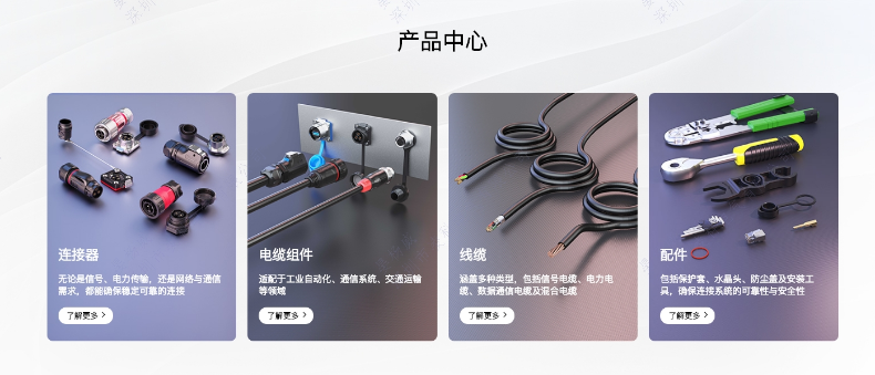 我們構建了“四大產品矩陣”:連接器、電纜組件、線纜、配件,搭配結構化的下拉菜單與清晰導航,幫助你一鍵直達所需。