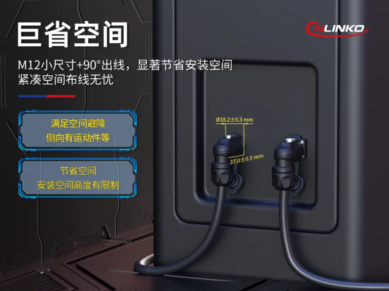 m12小尺寸并結合90°彎頭結構,最大化節省安裝空間,適配高密度布局。