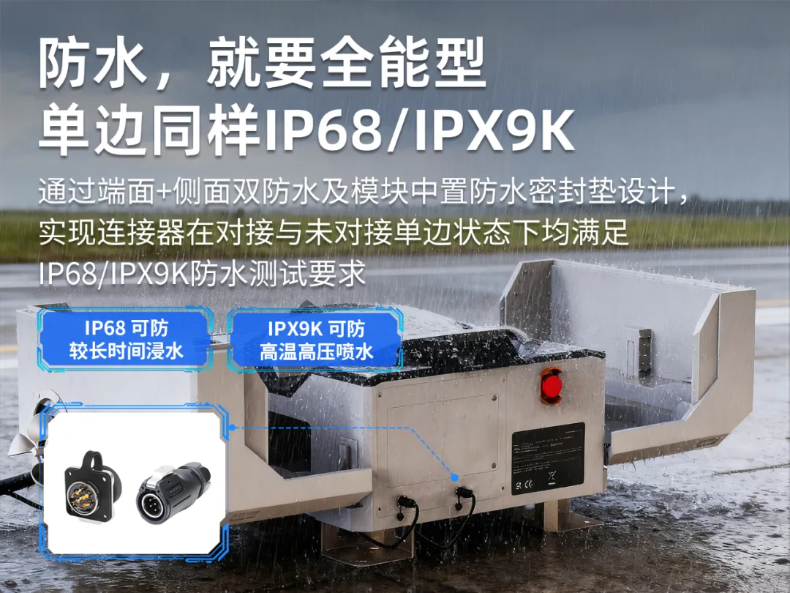 那么凌科LP20氣密性連接器滿足所需防水防塵要求嗎?何止滿足?簡直是超越。它具備滿貫級防水能力,滿足IP68/IPX9K防護等級,而且更難能可貴的是單邊也是同樣配置,即便拔下連接器,也不用擔心水液侵襲,這對于智能停機坪非常重要。