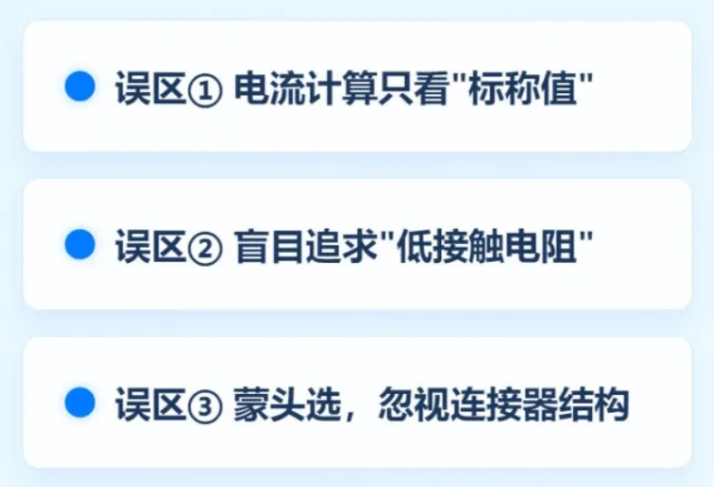 大電流連接器作為電力傳輸的“咽喉要道”,其選型直接影響設備可靠性。但許多工程師在選型時,往往過度依賴供應商的“標稱參數”,而忽略實際工況的復雜性。本文將從3大誤區出發,深度解析,助你避開“深坑”。