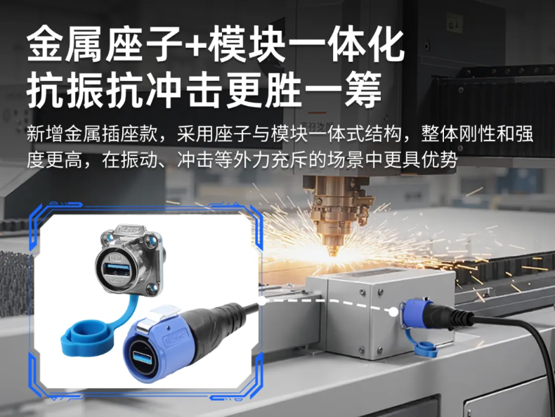 凌科LP20-USB連接器全新金屬插座,座子與模塊一體式結構,整體強度和剛性更強,更適配激光切割機訴求。特點如下: