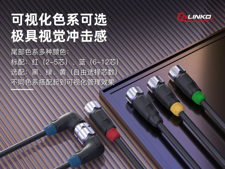 ②另可自選自配:黑、綠、黃(自由選擇芯數),這樣一來,所用4芯和8芯的LM12電纜組件通過顏色區分,一眼即辨,不會出現盲拆或記錯,導致誤拔連接器造成維護人員的不便之處。