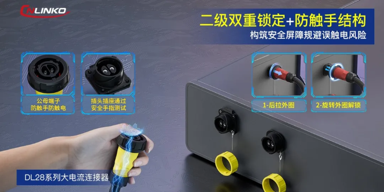 從物理隔離的防誤觸結構到穩固可靠的雙重鎖定系統,DL28系列連接器為工業、戶外等復雜嚴苛場景下的大電流連接應用,提供了值得信賴的安全保障,真正將“安全是命脈”的理念嵌入產品基因。